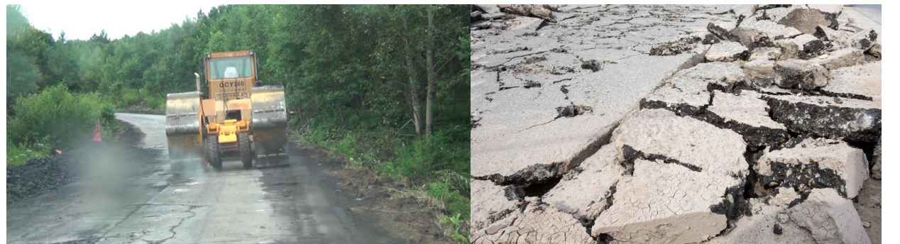 (1)打裂壓穩(wěn)。打裂壓穩(wěn)通常用于消除瀝青面層的反射裂縫。處理后的板塊長度應在30—100mm,打裂后,通過壓實有效地消除板下脫空,恢復基層對水泥混凝土板塊的支撐作用。打裂壓穩(wěn)技術成功地用于改造結構完好、僅存在功能性破壞的普通水泥混凝土路面。使用打裂壓穩(wěn)時須考慮到板塊整體性的損失。沖擊壓實設備對水泥混凝土路面的破碎就屬于典型的打裂壓穩(wěn)。