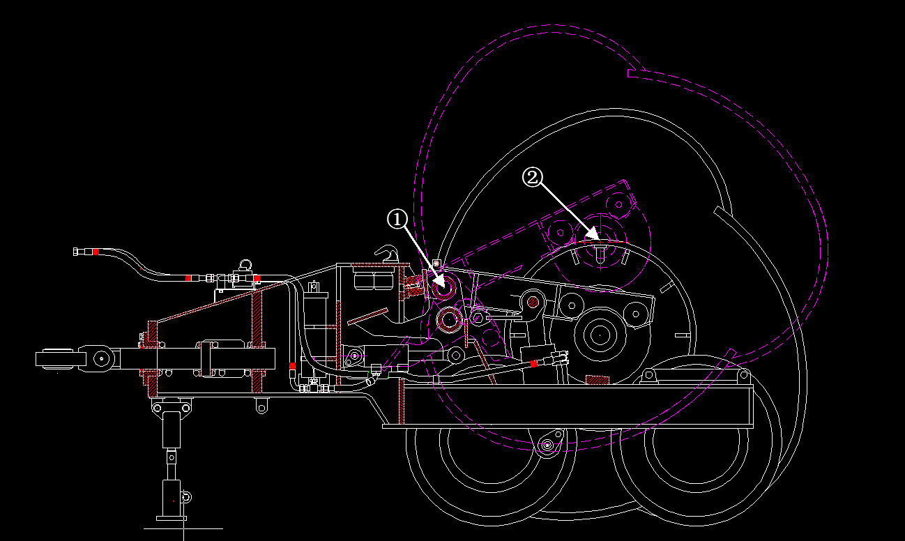 通過(guò)沖擊式壓路機(jī)設(shè)計(jì)圖紙(上圖),可以看到,當(dāng)沖擊壓實(shí)輪向上舉起時(shí),整個(gè)大輪包括軸管(千斤頂?shù)闹雾旤c(diǎn))都是沿著一個(gè)弧度方向上升的(見(jiàn)圖2),加上千斤頂?shù)闹雾旤c(diǎn)(軸管)與千斤頂頂頭的接觸面很小,很容易滑脫,造成重大事故!