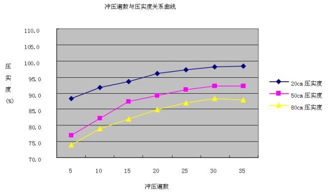 雖然沖擊壓實技術(shù)已在全國廣泛采用,但由于土質(zhì)、沖壓壓路機型號,應(yīng)用條件等各不相同,其壓實效果、施工工藝、質(zhì)量控制亦不相同,因此需要在施工前修筑試驗路段,以確定合適的施工工藝,質(zhì)量控制標準。